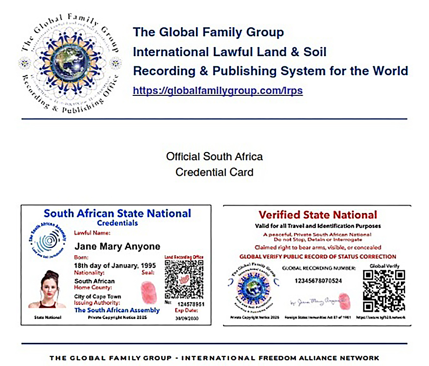 The Reconveyance repatriates you to your original political status and standing. This is then recorded with the international land and soil jurisdiction on The South African Land Recording Office.